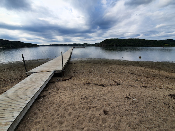 ånggrunt, sandstrand, stora gräsytor, mycket träd med möjlighet till skugga om man vill. Kiosk med både mat, glass och dricka, även lite leksaker. Toaletter. Brygga med hopptorn.