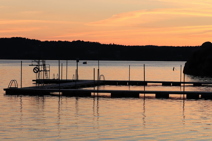 Vackert belägen badplats vid Gullmarsfjorden med höga klippväggar som tornar upp intill.